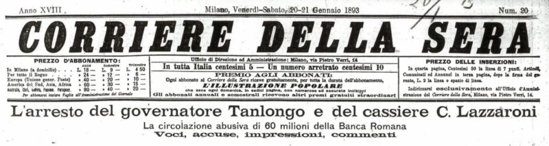 Nel 1892 – 93 guidò un suo primo governo, che fu travolto dallo scandalo di corruzione della Banca Romana. Erano emerse le malversazioni, gli atti di corruzione, e in generale le attività illecite portate avanti nel decennio precedente da Bernardo Tanlongo, governatore della Banca Romana, l’istituto di credito della politica e della finanza della capitale. La Banca Romana aveva sostenuto con prestiti e linee di credito la bolla speculativa legata all’espansione edilizia della capitale e aveva utilizzato gran parte delle riserve di cassa per corrompere politici e membri di governo. Alla fine, però, si trovò in una crisi di solvibilità e dovette dichiarare fallimento. A quel punto i giornali si buttarono sullo scandalo, che era davvero gravissimo e il governo ne fu travolto. Sotto la pressione della stampa e dell’opinione pubblica fu istituita una commissione d’inchiesta che portò a un processo dove, tra gli imputati, figuravano anche politici di primo piano, come lo stesso Francesco Crispi e Giovanni Giolitti. Il processo si chiuse con un’assoluzione generale, ma il governo dovette intervenire per sanare i debiti dell’istituto. Nessuno dei politici accusati subì conseguenze, tranne Giolitti che per dieci anni rimase escluso dalla politica che contava. Ma nel 1903 della Banca Romana non si ricordava più nessuno. Giolitti tornò protagonista della vita politica italiana dopo Adua e la caduta di Crispi.